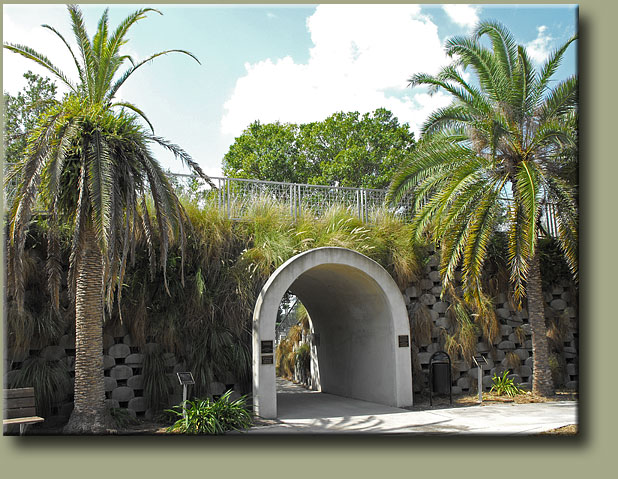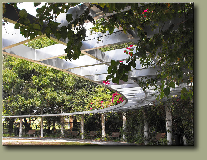 The walk on one half of the Plaza is shaded by date palm trees; the other half of the walk is covered by a simple arc shaped aluminum trellis covered with bougainvillea.