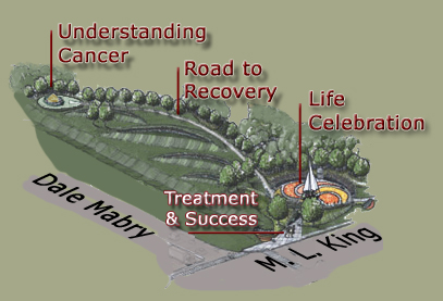 The various components of the plaza are designed to chronicle a cancer survivor's journey. It begins at the north end of the plaza with the raised sculpture platform, "Understanding Cancer". The central platform is a 13-foot high cone shaped stone monument encircled by a 24-foot diameter suspended aluminum "halo" supporting 48 individual pieces of artwork.
