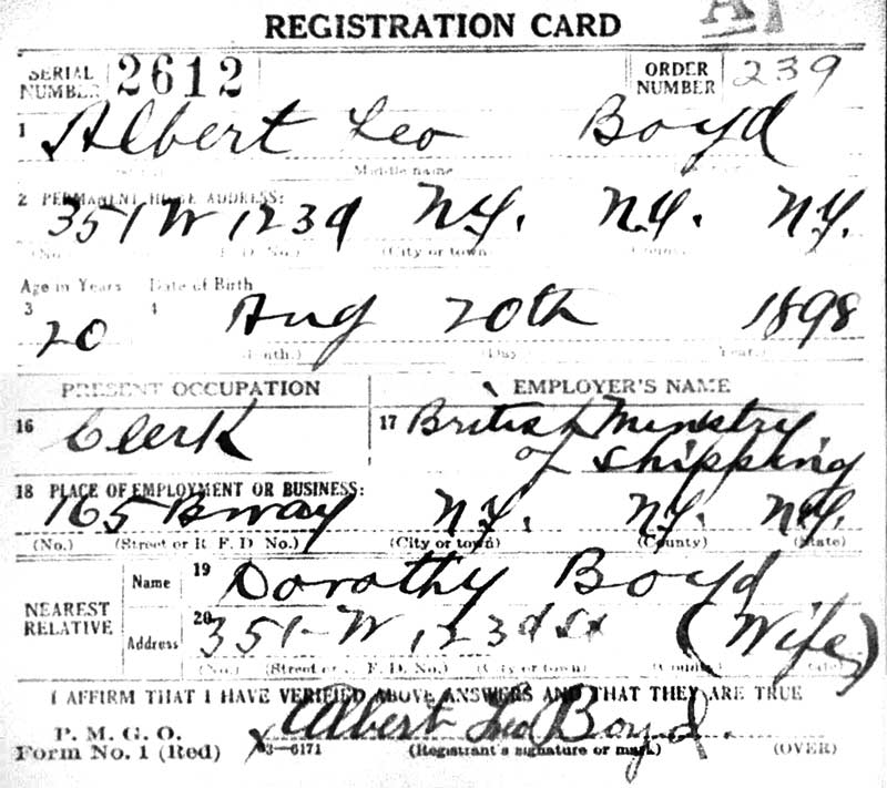for the WW1 draft in NYC. His registration card shows he was 20 years old and