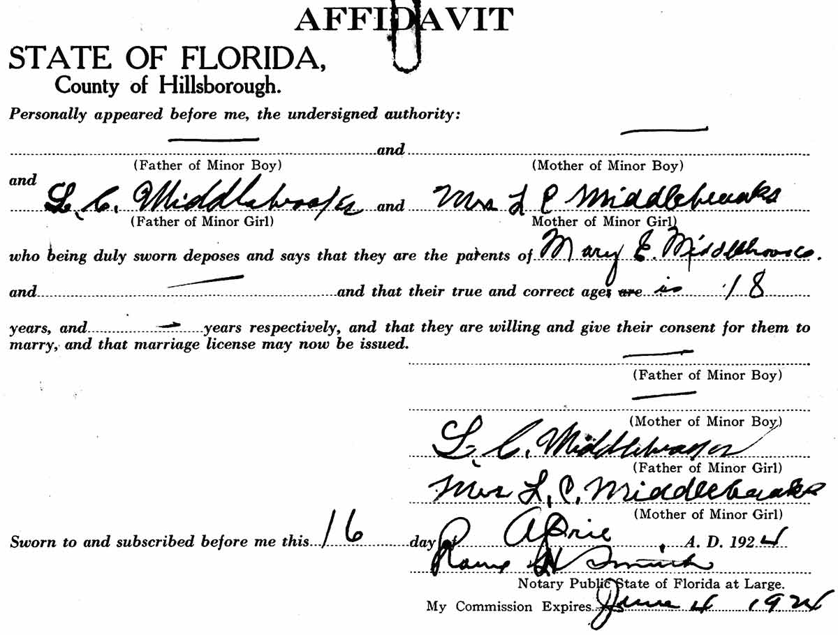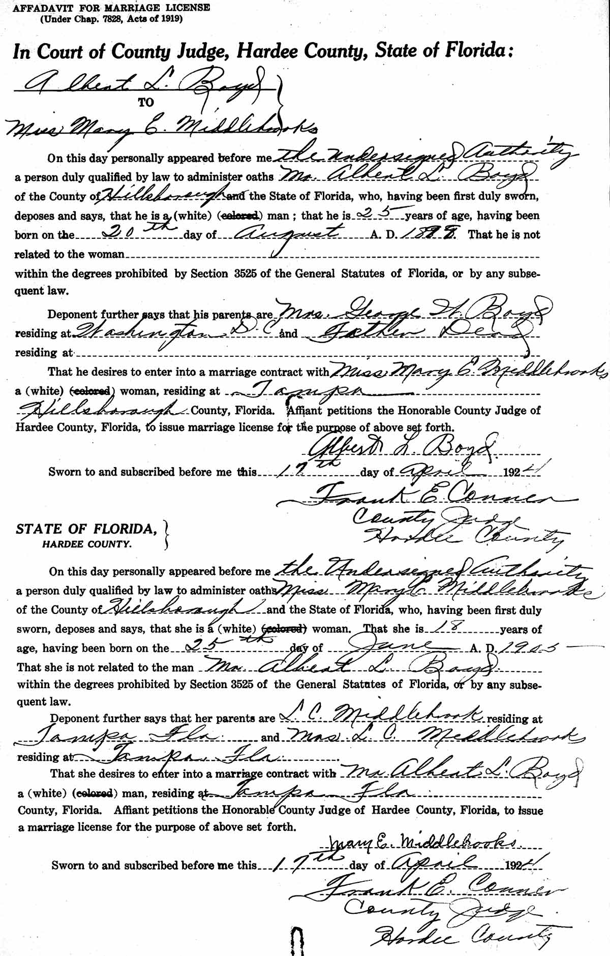 On Apr. 17, 1924, Albert Boyd married Miss Mary E. Middlebrook at Wauchula, Hardee County, Fla. He was 26, she