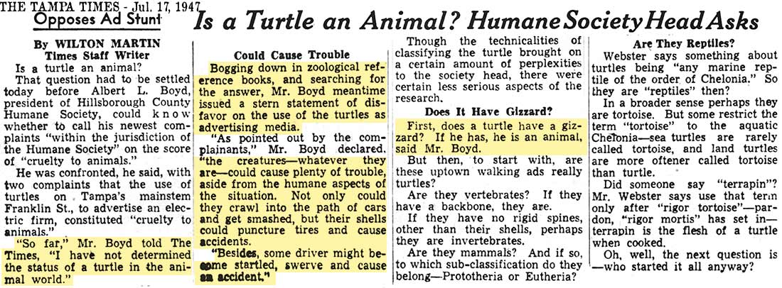 TO ANIMALS QUESTIONED CONCERNING TURTLE ADVERTISING