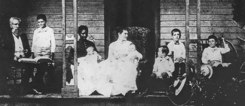 with grandfather J.T. Barlow on the porch, two of the boys in the window,