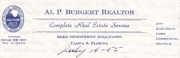 Al Burgert died January 5, 1956, in his home at 4107 Tacon Street, Tampa, of carcinoma of the lungs. He was survived by his brother Jean; his daughter-- Mrs. Adeline Burgert (DeLoache) Weiser, Mrs. Elaine Haglund (step-daughter), his second wife Ethel, his granddaughter Hazel DeLoache Heflin, and great granddaughters Diane and Kimberly Heflin.