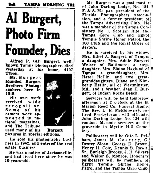 Burgert Brothers, Inc. In 1917, when Al and Jean Burgert formed their partnership to purchase W. A. Fishbaugh's commercial photography business, the fact that the brothers bought into an already established commercial concern might have influenced them to remain in commercial photography. There were a number of portrait studios in Tampa and few commercial studios. Al "didn't care at all" for portrait photography and at first would do only portraits for friends. Although his portrait work was every bit as good as his commercial photography, he enjoyed more the experience of going out on different assignments. Thel Burgert, an excellent and widely experienced photographer himself, distinguished between three major kinds of photography saying that "portrait work flatters people, commercial work has to be accurate, and in newspaper work you must get what you can as quickly as you can." Ultimately, Al Burgert would become adept at all three, but from the very beginning, he and his brother Jean were pre-eminently commercial photographers.