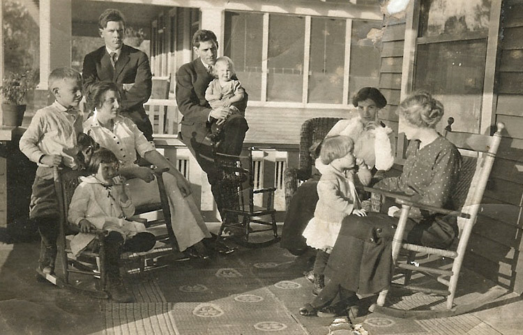 Far right seated in rocker is Hazel Baker Burgert with daughter Adeline in front of her. Behind Adeline, seated in rocker is Jeanette "Nettie" Johnson Burgert, wife of Harry Burgert. Al Burgert on the railing holding daughter Jean Evelyn. Seated on the left is Olive Baker King, sister of Hazel, with her husband Russell King behind her. Olive's children are next to her, Beverly and Fred "Junie" West, Jr. are from her first marriage, to Fred West. Junie died of appendicitis when he was not yet a teenager, and not less than a year later, Russell King was an innocent bystander when he shot and killed during a police shoot out. Russell King and Olive had one daughter together, Hazel King, mother of Joan Bednarek Rodriquez who provided the photo of the Burgert brothers at the dog sculpture in Plant Park.