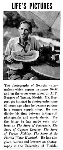The Burgert family knew Al to be an exceptional man. He was very outgoing, a natural salesman, and he was the public relations man for the firm. Al Burgert's friendliness and his dedication to his craft made him, in the eyes of his workers, the perfect employer. The main concern to Al as an employer was "whether you could do the work and were honest. He didn't care where a person came from or what their educational level was. If you showed that you were willing to learn and be honest, he would show you the rest." He would also take portraits of friends and not charge them, and frequently performed miscellaneous, free picture-taking for the various organizations to which he belonged.Simon Rose, later a highly successful portrait photographer in Tampa, was in large part trained by Al when Simon was a young man. He said that he and Al would pack equipment into AI's Cadillac and go out for an afternoon or whole day of shooting. Al would give Simon instructions on photographic technique while setting up equipment and while taking the final pictures. Al was a patient teacher, though according to Thel Burgert, Al was a perfectionist, always himself interested in any technical aspect of photography that could improve a picture. While on location, Al would talk to Simon about the proper angle the picture needed, how to deal with the sun, and explain other photographic matters a fledgling photographer such as Simon needed to learn.