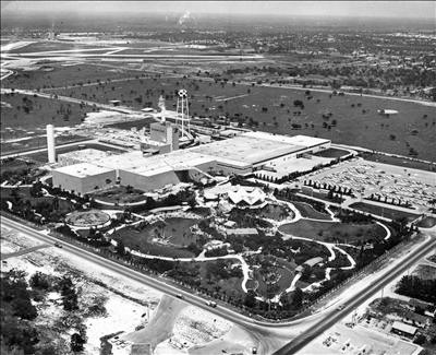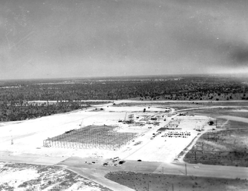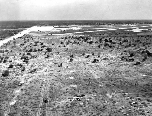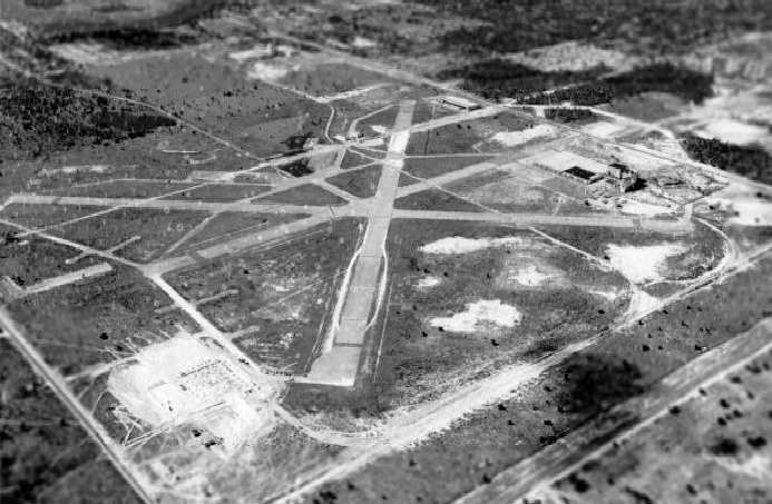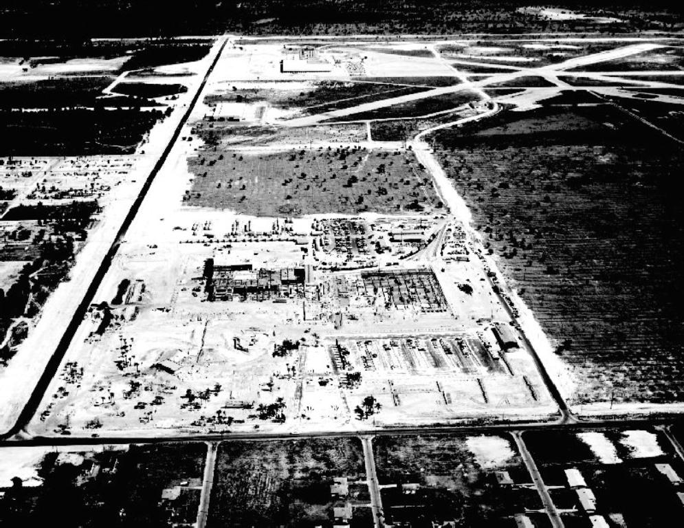 A 1959 view looking southwest at Henderson Field, after the Busch Brewery (on the right) had been built over a portion of the former airfield.