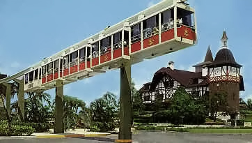 The monorail at Busch Gardens opened in 1966. This small suspended system operated boxy trains that used two propane fired, air cooled, aluminum Corvair engines per train to produce the AC power necessary for the electric motors.