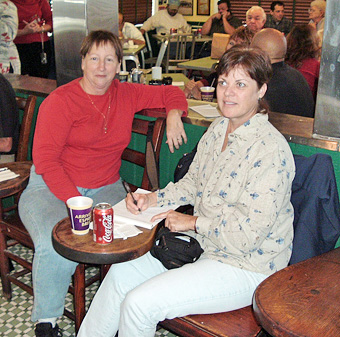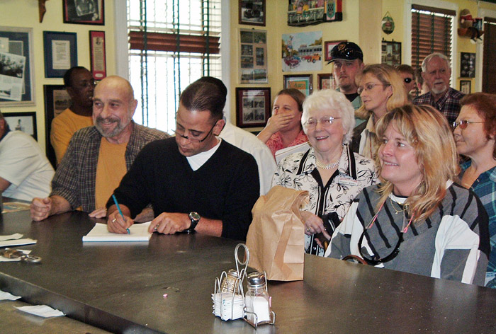 Yvonne and Mike autographing menu replicas from circa 1943.
