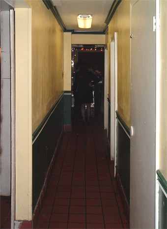 Looking down the hallway from the kitchen door to the serving area |