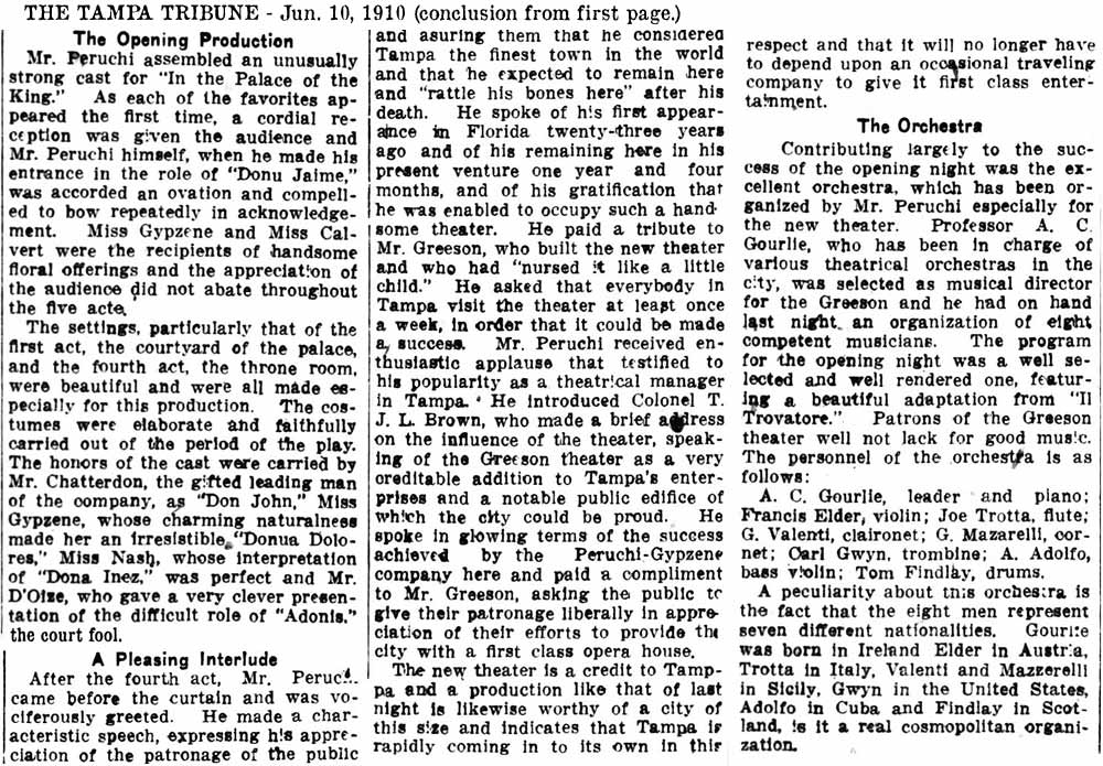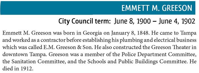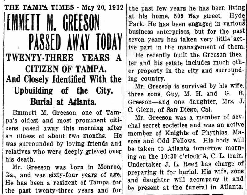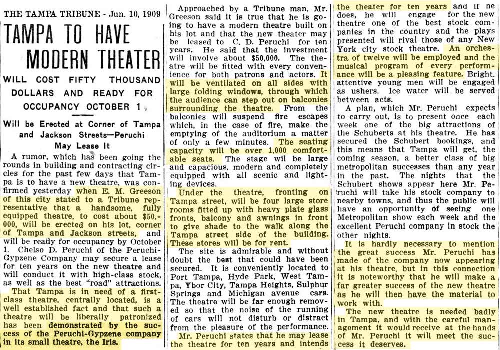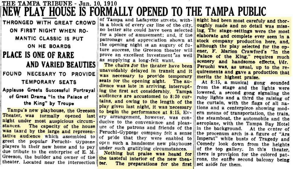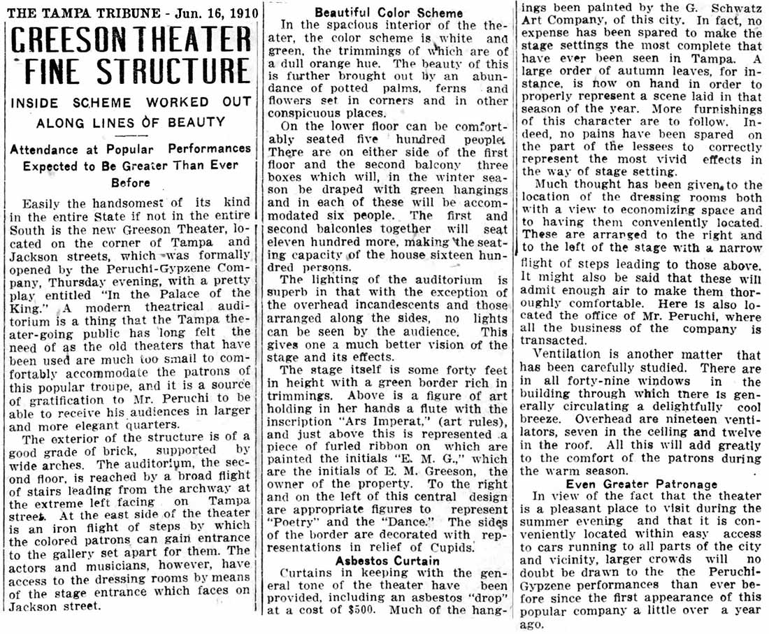 Plans to build the Greeson were announced in the summer of 1909 by Emmett M. Greeson, a prominent Tampa businessman and former Tampa City Council member. It was Tampa's first large, elaborate theater at an expenditure of about $50,000. No expense was spared in its construction and furnishings, seating well over 1,000 patrons comforatably. Chelso Peruchi, owner of a local acting company, planned to lease the theater for 10 years.