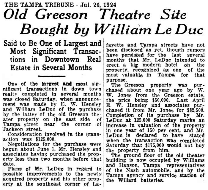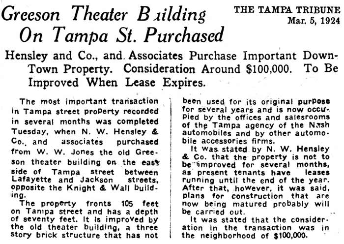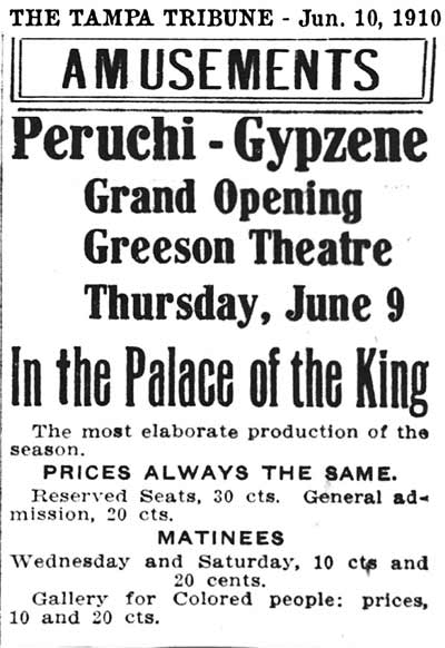 THE GREESON THEATER, TAMPA'S FIRST HIGH-CAPACITY ELABORATE THEATER