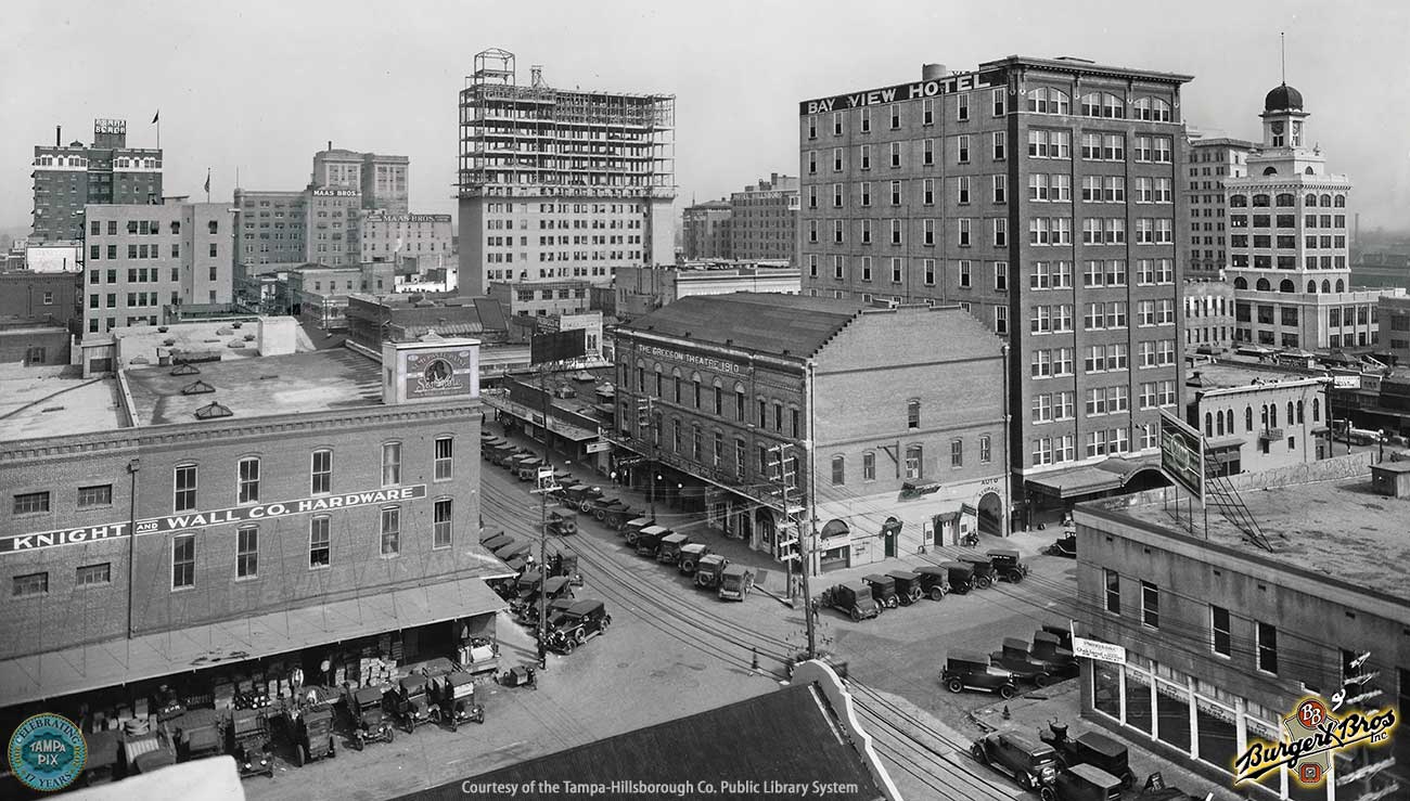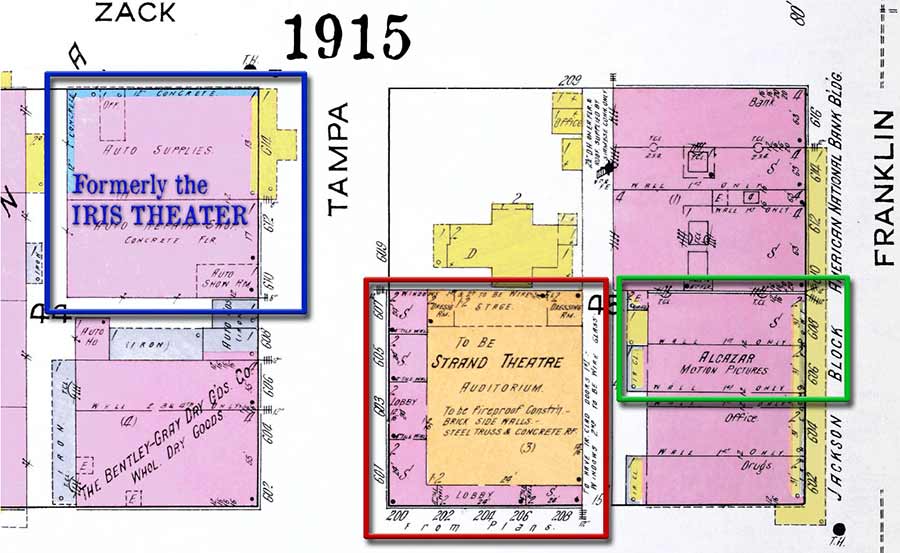 as a theater. The Greeson Theater was located on the 200 block of Jackson St. It can be seen below to the left of the Bay View Hotel, with Jackson St. running along the right and Tampa St. to the left. By this time it was no longer being used as a theater.