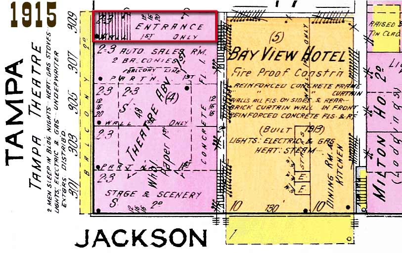THE GREESON IN 1915 The Greeson is labeled as "Tampa Theatre" with the entrance to the theater seen on the north end of the building as a stairway on the first floor. The auditorium occupied the 2nd & 3rd floors with the stage on the south end. The first floor consisted of an automobile sales room with the rest of the first floor occupied by a wholesale paper business. The notations that look like musical notes are fire escapes.
