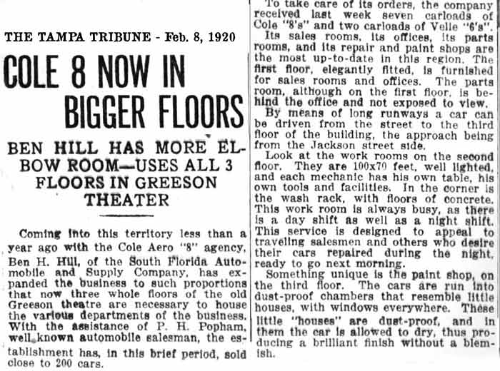 CONVERTED FOR AUTOMOTIVE INDUSTRY As "fine" a structure as it was, by 1920 it had been converted for use in the automotive industry. The Greeson was bought by W. W. Jones and used by Ben H. Hill who had converted it into three floors of his automobile business, selling is "Cole 8" and "Velie 6" cars. The first floor was elegantly fitted and furnished for sales rooms and offices, with the parts room behind the office out of view. The 2nd floor, formerly the auditorium. contained repair rooms measuring 100 x 70 feet, and the 3rd floor paint shops, as well as storage for cars. Cars could drive directly to the third floor through the entrance seen on the right against the Bay View Hotel.