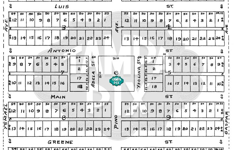 Hugh Macfarlane's West Tampa addition plat filed in March 1892 shows the original layout and street names planned for the first phase of his development. Antonio and Gaspar were the del Pino brothers. Ysmael, Ysolina and Adela were probably their wives and/or children. The del Pino brothers factory was the first in west Tampa in June 1892. |