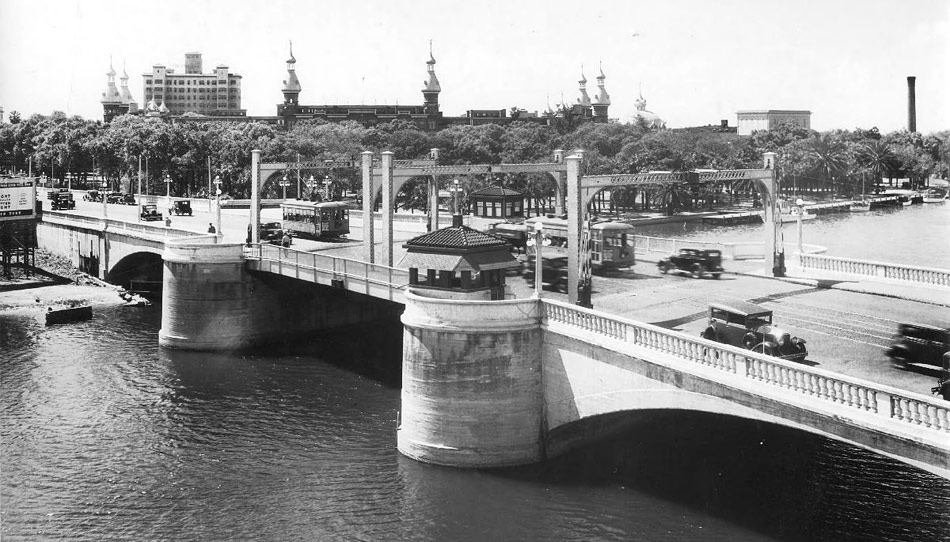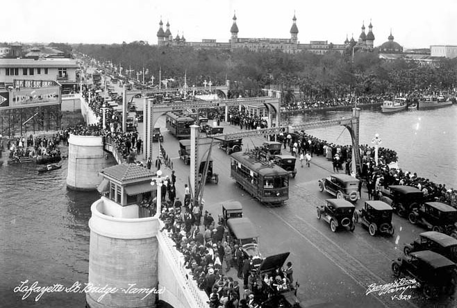 W. H. Hodge, of Boller, Hodge, & Baird, arrived in Tampa in mid-December to test the bridge. The engineer loaded two streetcars with 50,000 pounds each and two ten-ton steamrollers were sent across the draw at the same time. Hodge proclaimed, “She’s sound as a rock,” and the city opened the bridge. A trolley car passed over the river to Hyde Park, packed with city officials, engineers, newspapermen, and “other favored persons.” Peter O. Knight, who twenty years earlier had been a passenger in the first streetcar over the second Lafayette Street Bridge, was among the favored. Miss Marbury of Tampa Electric insisted on paying when she boarded the streetcar, thus becoming the first paying passenger over the bridge. The bridge opening became a private affair, with the general public held back from the bridge until the elites had finished claiming all of the “firsts.”