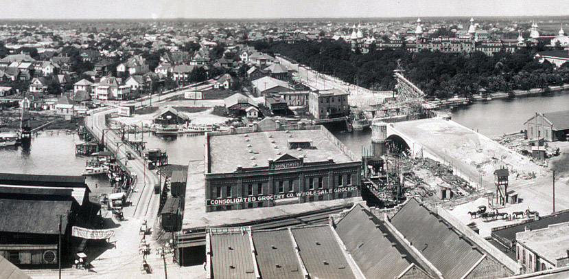 The design the engineers and councilmen chose for the new bridge was a reinforced concrete arch bridge with a movable span to accommodate river traffic. Reinforced concrete bridges combine the compression strength of concrete and the tensile strength of steel. Benefits included reduced maintenance costs and use of locally available materials. Since this type of bridge construction did not require highly skilled laborers, local workers could be employed. A less measurable benefit was the improved aesthetics of a concrete arch compared to a steel truss; however, this was important given the bridge’s location in the heart of Tampa, in plain view of the central business district and the Tampa Bay Hotel. Steamboats docked at the foot of the bridge, so the structure was many visitors’ first impression of the city. Whereas the 1896 bridge was only seven feet above the low water level, the new bridge was to be 16 feet above low water, theoretically resulting in a 66 percent reduction in the number of times the draw bridge would need to open. The center opening was to be 70 feet wide, compared to 54 feet on the old bridge. Some alignment changes were necessary for Lafayette Street on the west side of the river, near the Tampa Bay Park, and a row of trees was removed. The change in clearance required a three percent grade from the Atlantic Coastline Railroad tracks to the center of the bridge, and changes in the approaches. The L. J. Jones Building on the east side of the river was now in the line of the bridge, and had to be demolished. |