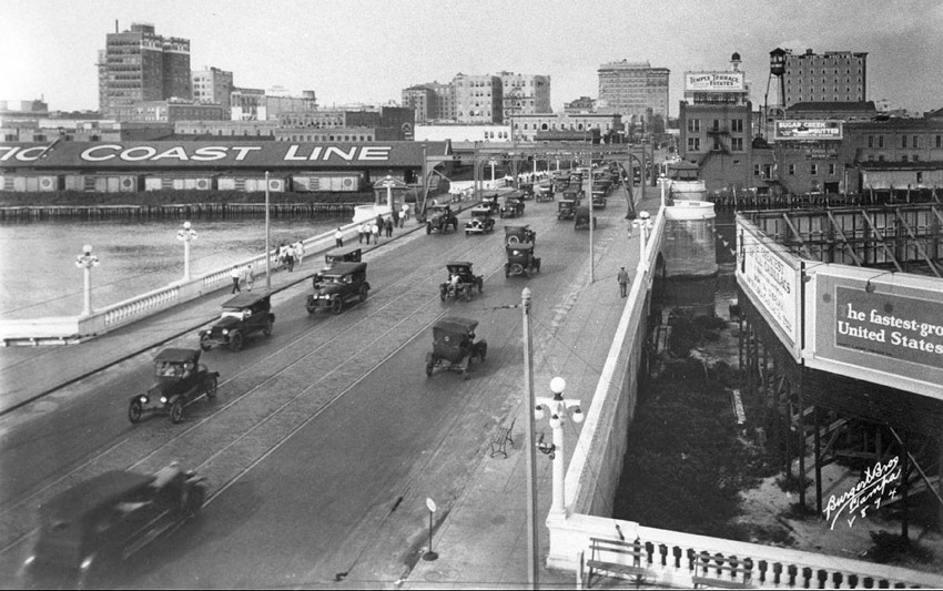 On February 23, 1914, the mayor led the formal dedication of the new bridge. A review stand on the west approach of the bridge provided seating for 1,800 people, including nearly 600 special box seats. At three o’clock in the afternoon, all traffic over the bridge stopped, the crowds edged closer to the grandstand, and the soldiers stood at attention. The mayor began by recalling that the old bridge had been unable to keep up with Tampa’s growth and increasing business. Always the politician, McKay reminded the voters that the bridge had long been an issue in municipal elections, but that it was not until he had been elected mayor that significant progress was made: “Sufficient to say, the problem has been solved – to the satisfaction, I hope, of all the people concerned.” Another speaker, Judge Parkhill, followed up on this theme, saying that although the project had been difficult to get started, and there had been many challenges along the way, he was sure that “the people of Tampa as a whole were thoroughly satisfied that it had been an absolute necessity and of great benefit to the people at large.” For its part, the Times added to the sense of consensus by reporting “Both the address of the mayor and the speech of Judge Parkhill were received with round after round of applause from both the people on the grandstand and the vast concourse that thronged the street.” |