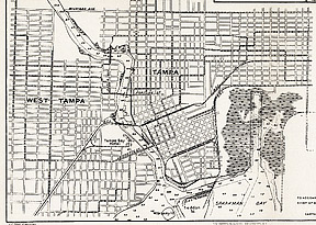 By the end of the week of August 15, 1906, the Tampa Electric street cars were running from the farthest end of West Tampa to Twenty-Second Street in Ybor City. The Tampa & Sulphur Springs Traction Company, who was competing with Tampa Electric Co., used a different route from West Tampa to Ybor. At the northern extremity of Garcia Avenue, the Tampa and Sulphur Springs Traction Company was building the Ross Avenue Bridge across the Hillsborough River on which the tracks were laid for the direct street car line linking Ybor City and West Tampa. The bridge became known as the Garcia Avenue bridge and was located just east of today's bridge on North Boulevard (the Holtsinger bridge.) Many cigar makers worked in West Tampa and lived in Ybor City and vice versa. |