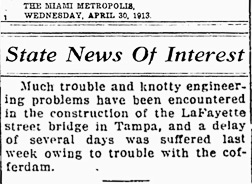 Macfarlane fervently denied any potential personal gain from the proposal to use the Fortune Street Bridge, saying that he actually stood to gain more from Jones’ proposal for a temporary bridge, which would help Macfarlane develop his North Hyde Park property. He further identified himself as the largest taxpayer in West Tampa, money that was paying for North Boulevard to be paved in anticipation of the increased traffic over the Fortune Street Bridge while the Lafayette Street Bridge was under construction. Henry Giddens, President of the Retail Dealers Association, apologized to the council for Jones’ comments, but the incident is an intriguing example of the overlapping political and business interests of Tampa’s leaders. |