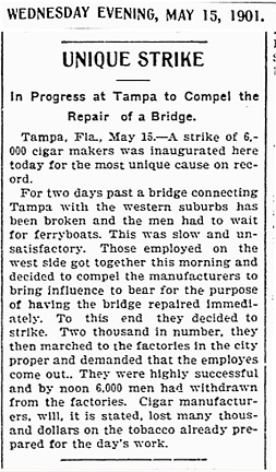 Councilman Hugh Macfarlane was the most outspoken opponent of the temporary bridge at Jackson Street. Macfarlane asserted that it was unfair to make taxpayers in Tampa Heights or Ybor City pay for something that was just a convenience to a handful of businessmen: “A bridge used principally for the private convenience of a few businessmen, should be built by those men and they should not ask the city to draw money from all the tax payers for such construction.” Still fresh in Macfarlane’s mind was the fact that he himself had contributed significantly to the privately funded construction of the Fortune Street Bridge, which was subsequently given to the City of Tampa free of charge. However, the Fortune Street Bridge had made the city’s leaders so aware of what could happen if a bridge were to be closed for several months. In May 1901, a barge hit the Fortune Street Bridge, causing so much damage that the bridge was closed for repairs for several months. The streetcar line over the bridge was the main connection between West Tampa and Ybor City, and with the bridge closed, the streetcar could not cross at that point. People who lived on one side of the river but worked on the other had to rely on slow ferry service, adding sometimes hours to commute time. Eventually, fed up with the plodding pace of bridge repairs, over one thousand cigar factory workers marched on city hall demanding action. In addition to foreseeable personal inconvenience, anything that caused labor unrest was sure to make a deep and lasting impression on Tampa’s businessmen and councilmen. |