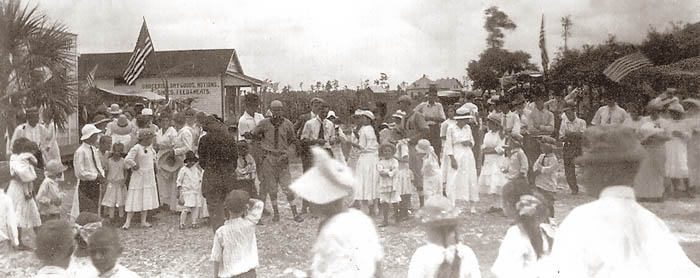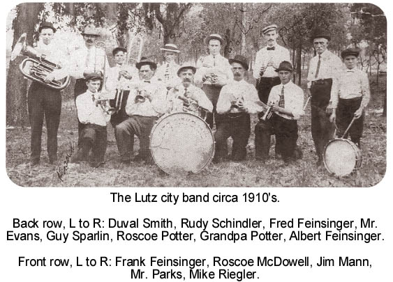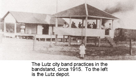 In 1914 Lutz had the look of many small American towns before the coming of the automobile. The center of town was bounded on the north by Vernon Rd, on the east by the Tampa Northern RR, on the south by Palm Avenue (First Ave. SW), and on the west by First St. SW. Within that area a bandstand was built so that the Lutz city band (formed in 1913) could perform in these pre-radio days. Concerts were held there on Sunday afternoons, and special occasions such as July 4th. |