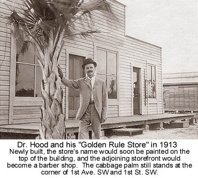 Walking west from the bandstand to First Street SW, residents would pass George Polen's general store, Dr. W. J. Hood's "Golden Rule" store, and attached to it Evans' Barber Shop. Walking south to Palm Avenue (First Ave. SW) they would have passed a two-story building that was originally North Tampa Stores and possibly another building, Chambers Store. Then counterclockwise to the east, the old bed of the Tampa and Gulf Coast RR, the train depot, Guy Sparlin's Railroad Restaurant, and the Tampa Northern Railroad tracks. |