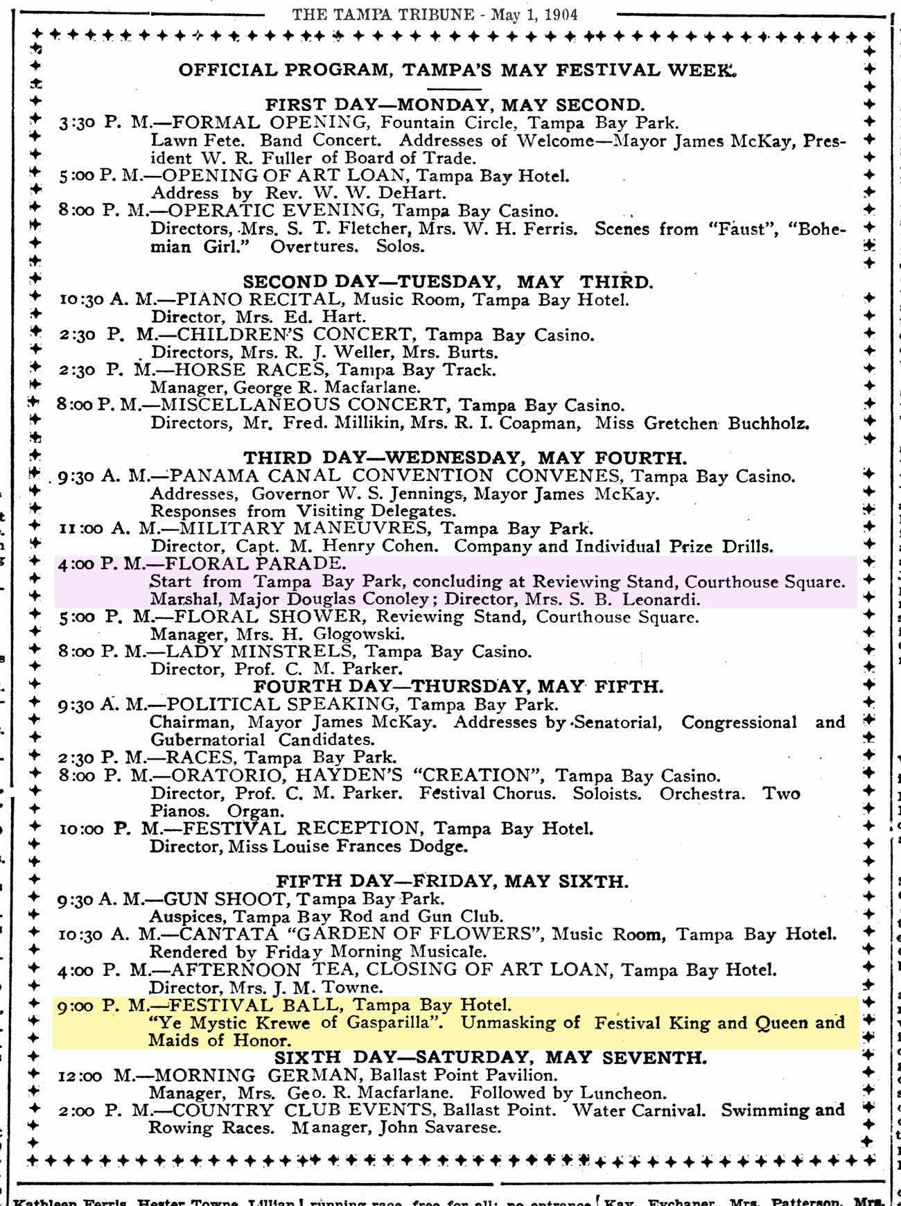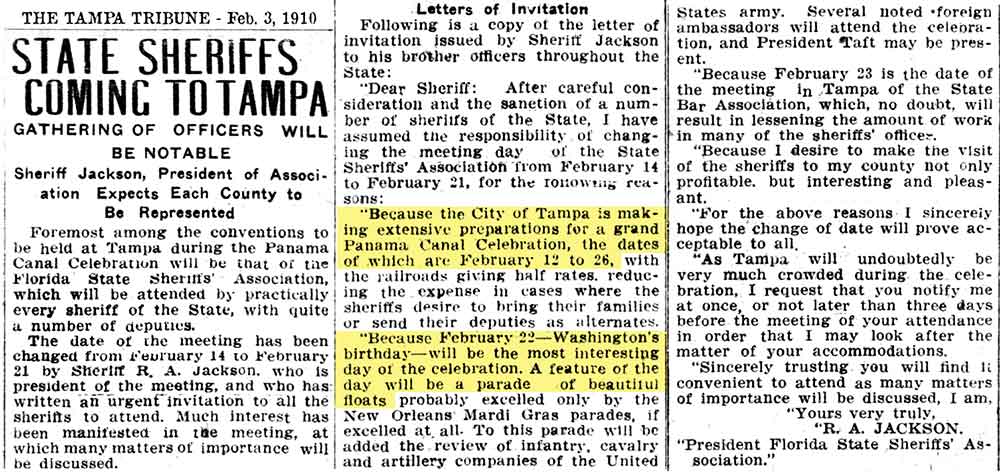 Panama Canal celebration, the floral parade, and the Gasparilla Ball