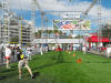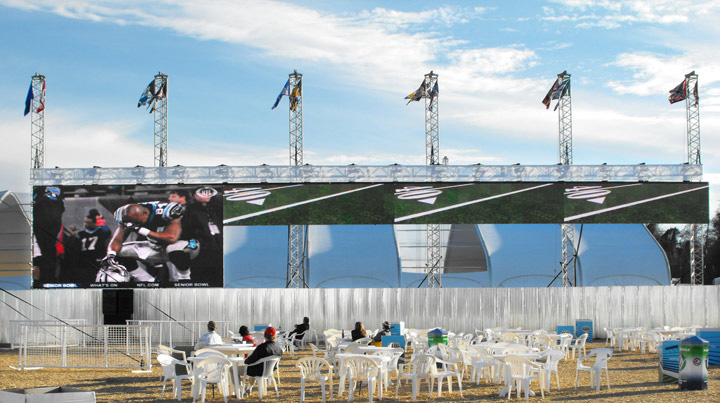 One of two giant video screens on each side of Lombardi Plaza