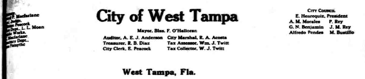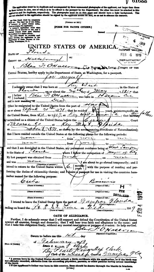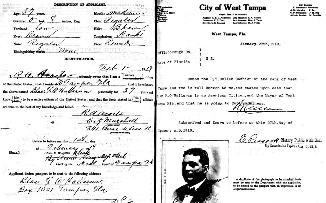 Blas Clemente F. O'Halloran, Mayor of West Tampa, 1919 Application for
