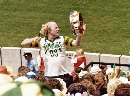 Krazy George (Henderson), professional cheerleader and inventor of "The Wave", whips the crowd to a frenzy at a Rowdies / Cosmos match at Tampa Stadium, May 29, 1977. |