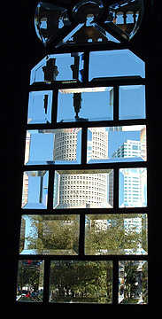 the beveled glass doors of the lobby.