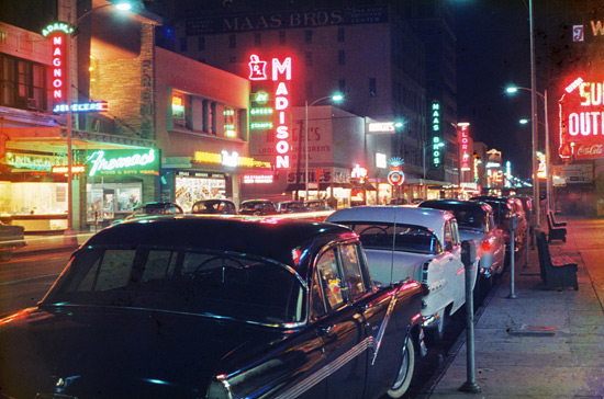 This circa 1956 view of the 500, 600 and 700 block of Franklin St. was taken by Hector Colado and provided courtesy of his daughter, Yvonne.  Cinchett Neon Signs built many of the colorful neon signs in this photo, including the elaborate Duval Jewelry Store "diamonds" that adorned the front facade of the store.
