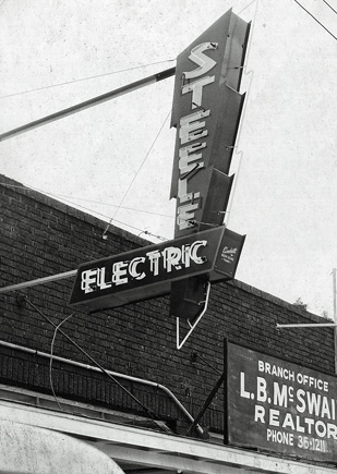 This “striking” neon sign for Steele Electric is actually a giant neon lightning bolt.  Hopefully none of their customers were superstitious!
