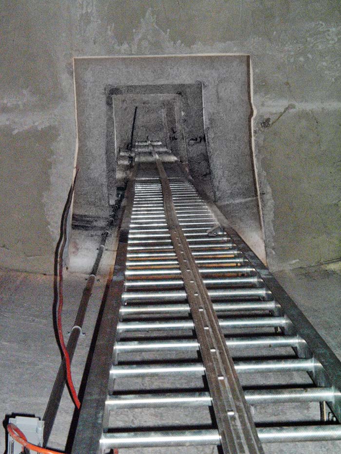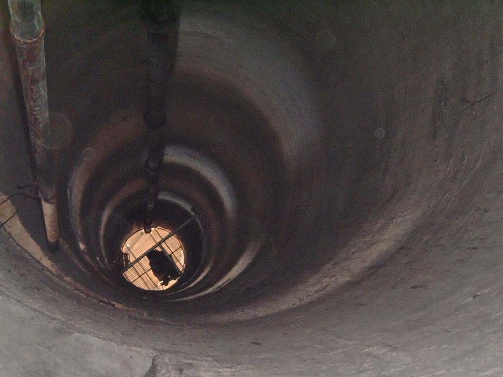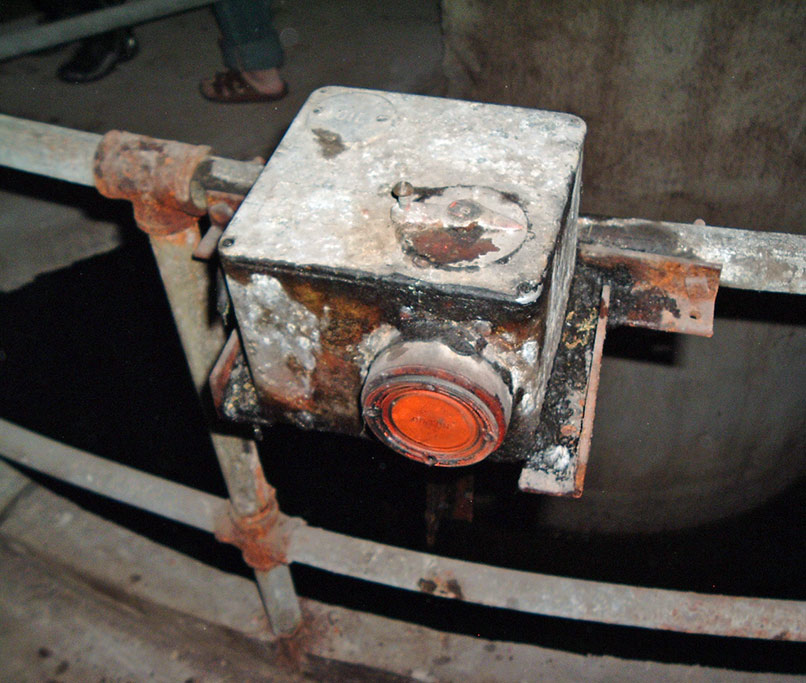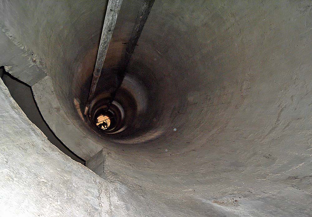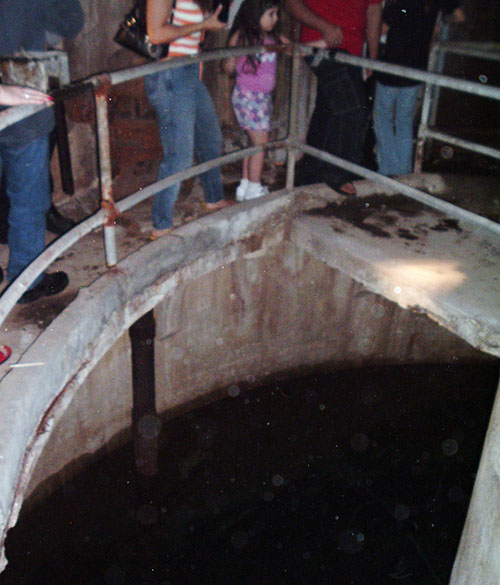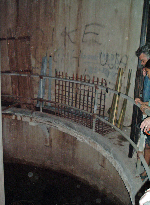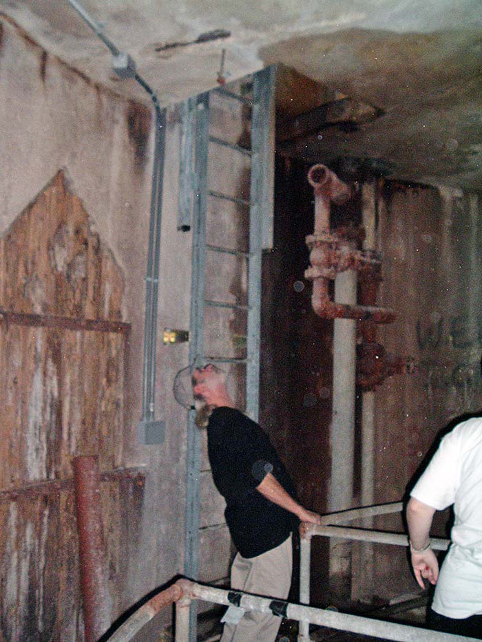 The floor of the tower is flooded with water from the natural spring that bubbles up beneath it. Photo at left shows the bridge that connects the outer catwalk to the inner supporting core.