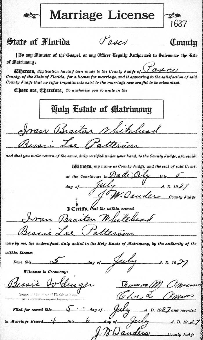 By 1920 Ivan B. Whitehead had gone out on his own and had moved to Baltimore where he was living in a boarding house. He was 19 and single, and working as a corker in a shipyard. Later it was called "caulking;" filling in gaps usually in the construction of wooden boats and ships, but being a welder it probably meant he welded seams on ships. Ivan was in Florida by July 1927 because this is where he married Bessie Lee Patterson. They were married by County Judge J. W. Sanders on July 5 at the Pasco County courthouse in Dade City. Ivan was 27, Bessie was 19.