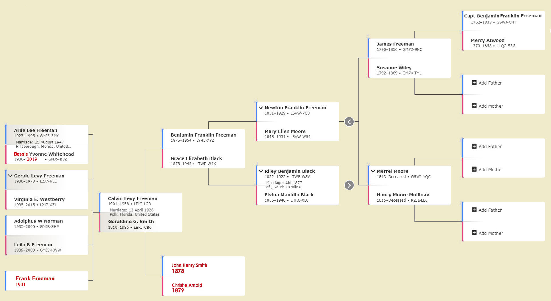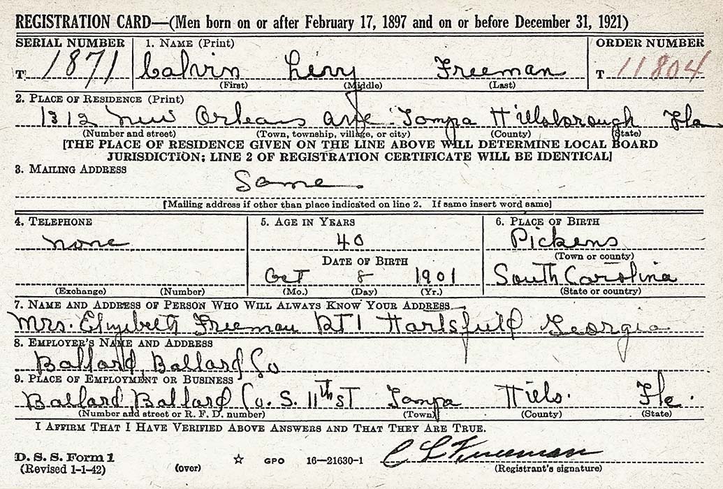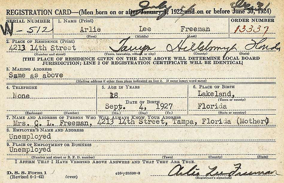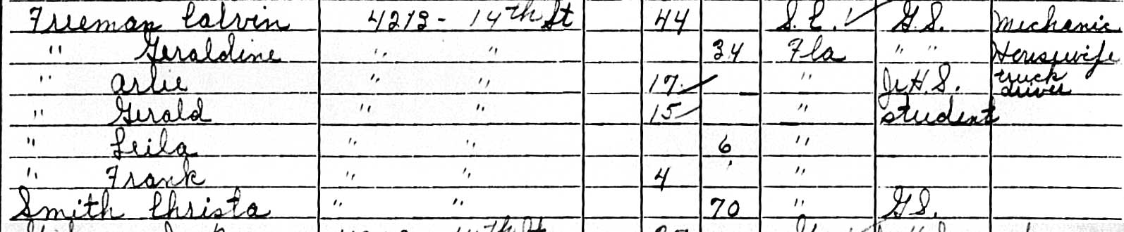 THE FREEMANS Arlie Lee Freeman was born Sept. 4, 1927 in Hills. Co, Fla, he was a son of Calvin Levy Freeman (b. Oct 8, 1901, Pickens, SC) and Geraldine G. Smith (b. Sept. 19, 1910, Fla.) Calvin & Geraldine married on April 26, 1926 in Polk Co. In 1930, Arlie's parents, Calvin L. Freeman and Geraldine, were living with her parents, John Henry Smith (51) and Christie Arnold Smith (50) at 612 Myrtle St. in Lakeland, Fla. (In 1920 John H. Smith & wife Christie Arnold Smith lived in Plant City.) Geraldine's father, John H. Smith, worked for the City of Lakeland sanitation dept. Arlie's father, Calvin Freeman, was 27 and working as a laborer at odd jobs. He and Geraldine (who was age 19 at the time), show they first married when they were age 23 & 15 respectively. Arlie was 2½ and Gerald was 3 mos. Calvin Levy Freeman was the 3rd of 11 children of Benjamin Franklin Freeman (b. Mar. 5,1876, Anderson, SC) and Grace Elizabeth Black (b. Aug.1878, SC). In 1940, Arlie's parents, Calvin & Geraldine Freeman lived at 1510 New Orleans Ave. in Tampa. Calvin was working as a truck driver for a flour and feed company. He was 38, Geraldine was 29. Their children were Arlie L. 12, Gerald L. 10, and Leila B. 1. Arlie was in the 6th grade.