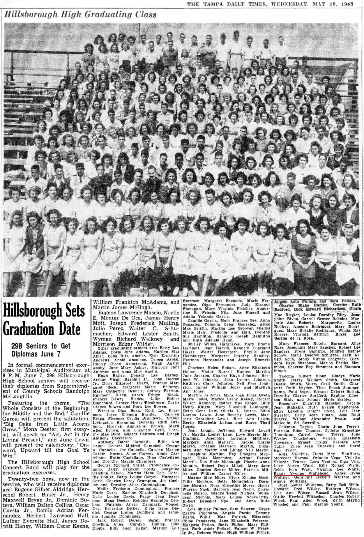 Bessie Yvonne Whitehead was born July 27, 1928, probably in Dade City or in the area of Crystal Springs, Florida. As a child, Yvonne grew up in Crystal Springs. She was probably named for her mother and father. By 1930 Ivan and Bessie were back in Akron. Ivan worked as a tractor operator in the rubber industry, probably some type of machine at a tire factory, being in Akron. Most of the other men on that census page work in the same business. Ivan was 30, Bessie was 22 from Virginia, as were her parents. B. Yvonne was 1yr & 8 mos. Florida held state censuses in 1885, 1935 and 1945. By the time of the census in 1935 the Whiteheads had moved back to Florida and were living outside the city limits of Crystal Springs. Ivan was 35, Bessie L. was 27, and Bessie Yvonne was 6. Ivan had a 10th grade education, Bessie, a 7th grade education, and Bessie Yvonne was attending first grade. Ivan shows that he owned his home and was farming at this time, probably as a result of the Great Depression. There were plenty of "truck farms" in that area in those days. Farmers would grow their produce and take them into the city and sell it directly to wholesalers or retailers, probably Tampa, on a truck--hence the term "truck farmer." Two dwellings away was Ivan's widowed father, Wm. B. Whitehead. He was 68 with an 8th grade education, renting his residence, and working as a foundry man. 1940 finds the Whiteheads in the same place, on the south side of Crystal Springs. Ivan was 40. With the U.S. practically out of the Great Depression, and another World War taking place in Europe, more industrial jobs were available and Ivan was back in the ship building field, working as a burner at a ship yard. Surely this was in Tampa so his commute was quite long. Bessie Lee was 32, Yvonne was 11 and in the 7th grade, an now the Whiteheads had a son, Ivan Jr. who was 3 years old (b. circa 1937.) Now neighbors, Ivan's father was listed as "Whitehead, W. Burt" was 74, and widowed with no occupation. Florida's 1945 census shows the Whiteheads in Tampa at 4200 13th Street. Ivan, then 45, worked as a welder; probably in a ship yard in the Port of Tampa. Bessie was 37, Yvonne 16, and by this time a senior at Hillsborough High School. Her brother is listed as "Lannie" here, age 8. Perhaps he wasn't really a Jr. but the enumerator listed him as such in 1940, and Lannie may have been his middle name.