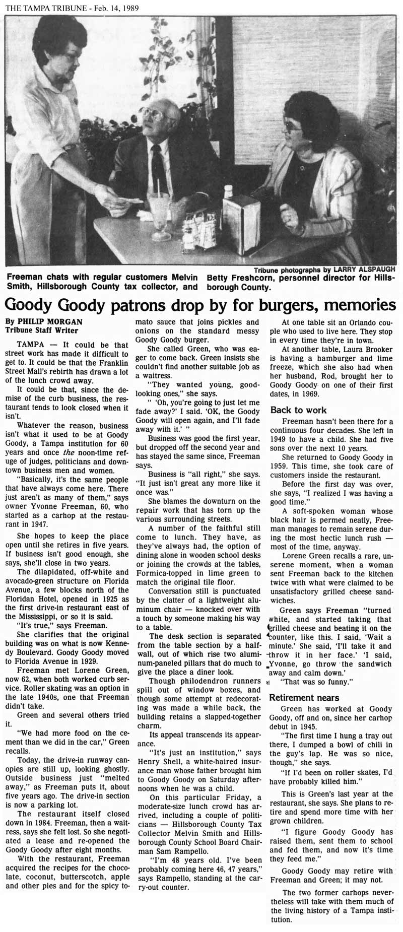 She worked as a carhop back then at the Goody Goody, from 1947 to 1949. In the next 10 years, she and Arlie had five sons. After that 10-year period away from Goody Goody, she returned to work in the restaurant in 1959 as a waitress. She said she once served Col. Harland Sanders, the founder of Kentucky Fried Chicken.