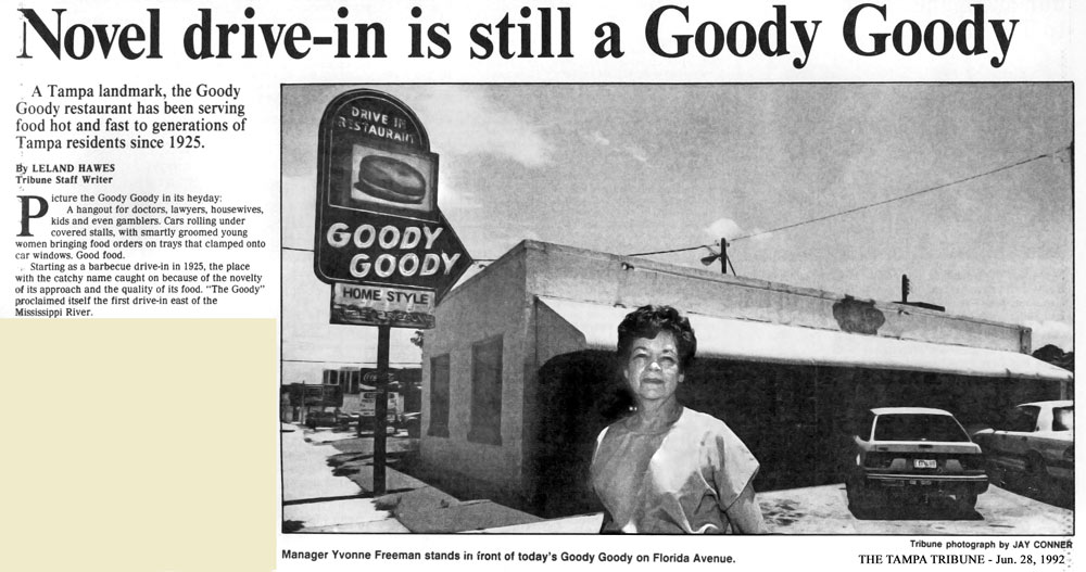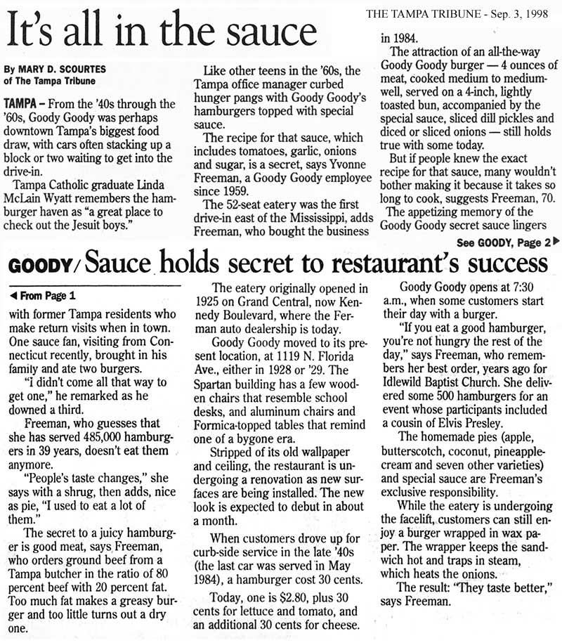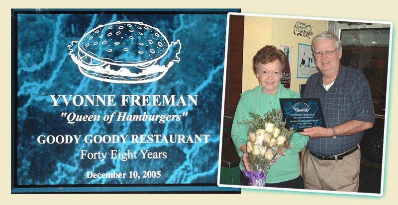 Yvonne took exclusive responsibility of making the secret sauce, a recipe handed down unchanged from the Stephens years, through the Stayer years, and all her years at Goody Goody. She also continued making the delicious homemade pies herself. Her pies (butterscotch, pineapple cream, traditional apple, French Apple, coconut cream, banana cream, pineapple cream, chocolate cream, pecan, lemon meringue, and seasonally, pumpkin) were just as famous, if not more famous, than the Goody Goody burger with special secret sauce.