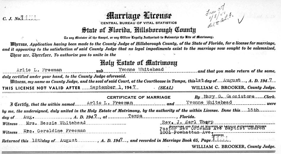 On Aug. 15, 1947 Yvonne married Arlie Freeman at the same courthouse where her parents were wed, in Dade City, Fla. Their mothers were witnesses to the marriage.